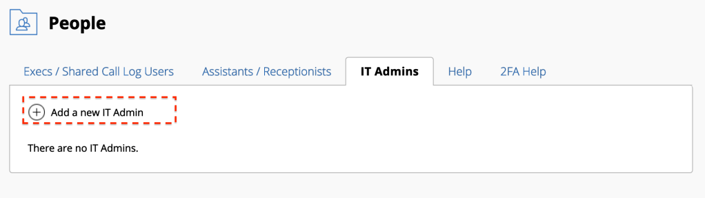 IT Admins can be added to an account by any existing Admin, under the People menu. There is a tab specifically for adding IT Admins. Like all user accounts, there can be only one instance of an email address in our systems (the email is the unique identifier). If you need to be the IT Admin for multiple accounts, you will need multiple email addresses. If you need to merge accounts, this can be arranged through CallPlease Support