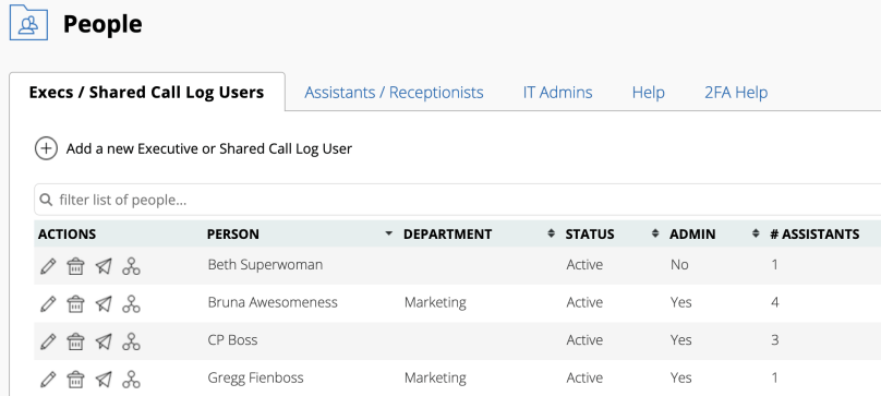 Company Admins and IT Admins can also reset passwords. In the People menu, there are cute little paper airplanes next to each user’s name. Those icons, when clicked, reset the password of that user and immediately send them a Password Reset email to the address on their account and from support@callplease.com
