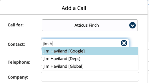 CallPlease allows an Assistant to use the personal address book of an Executive to add calls to the log. For basic accounts, this means having access to the contacts that are imported into the Executive’s CallPlease address book and the contacts added when adding new contacts to the log. For Enterprise accounts, this includes the connected address book of Microsoft Office or Google Contacts. In the Add a Call screen, contacts from the Exec’s personal address book in CallPlease appear without a suffix. Contacts from Google and Microsoft have a suffix that makes it clear where they are coming from ([Google] or [Microsoft]). Contacts from the shared Department address book or the company-wide Global also appear in this search.